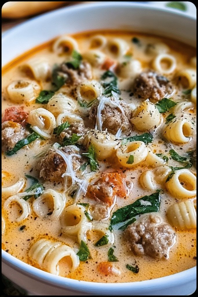 Creamy Parmesan Italian Sausage Ditalini Soup represents the kind of comforting, soul-satisfying food that brings everyone to the table with anticipation and leaves them feeling completely content. This recipe proves that restaurant-quality, deeply flavorful soups don’t require hours of simmering or complicated techniques—just quality ingredients added in the right order with attention to building layers of flavor. The combination of savory sausage, nutty Parmesan, and velvety cream creates a luxurious experience that feels indulgent while remaining approachable enough for regular weeknight rotation. The aroma that fills your kitchen as this soup simmers—golden sausage, aromatic garlic, and melting Parmesan—creates that cozy Italian café atmosphere that makes cooking feel like a reward in itself. Whether you’re serving this to family on a busy Tuesday, meal prepping for the week ahead, or ladling it into bowls for casual entertaining, it consistently delivers satisfaction and comfort. The versatility allows you to adapt it to dietary needs, seasonal ingredients, or whatever you have on hand, while the make-ahead friendly nature means you can enjoy even better flavor the next day with minimal effort. Every spoonful delivers that perfect combination of creamy broth, tender pasta, savory sausage, and nutty cheese that makes this soup the kind of recipe you’ll return to again and again, especially when you need a bowl of warmth and comfort to chase away the chill.