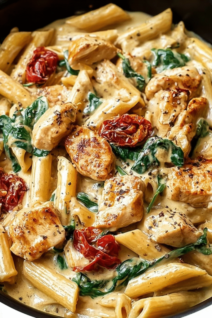 Creamy Tuscan Chicken Pasta exemplifies how simple ingredients transformed through proper technique can create restaurant-quality results that make home cooking feel like a celebration rather than a chore. This recipe demonstrates that you don’t need exotic ingredients, expensive equipment, or culinary school training to produce dishes that look stunning and taste extraordinary—just quality components, attention to detail, and understanding of basic cooking principles. The combination of tender, golden chicken with velvety Parmesan cream sauce studded with tangy sun-dried tomatoes and vibrant spinach delivers the kind of satisfying, comforting meal that brings families together around the table and impresses dinner guests without requiring all-day preparation. Beyond its delicious taste, this dish offers practical advantages for modern home cooks: it comes together quickly enough for weeknight feasibility, uses ingredients readily available at standard grocery stores, and presents beautifully with minimal plating effort. The rustic Tuscan character—earthy, hearty, elegant yet approachable—captures the essence of Italian cooking philosophy where simple preparations highlight quality ingredients rather than masking them with complexity. For lighter variations, consider using chicken tenderloins instead of breasts, reducing cream to ¾ cup while increasing broth slightly, or serving smaller portions as a first course rather than main dish. However you choose to prepare it, this Creamy Tuscan Chicken Pasta proves that sometimes the most memorable meals come from honoring classic flavor combinations while executing fundamental techniques with care, creating food that nourishes both body and soul while making ordinary evenings feel extraordinary.