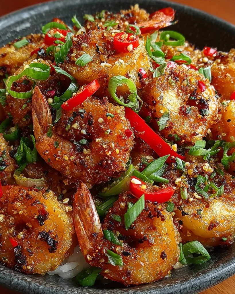Season and Garnish Once all the shrimp are fried and drained, transfer them to a serving platter while still hot. Immediately sprinkle with the finely chopped green onions and sesame seeds (if using), tossing gently to distribute the garnishes evenly. The residual heat will slightly soften the green onions and toast the sesame seeds, releasing their flavors.