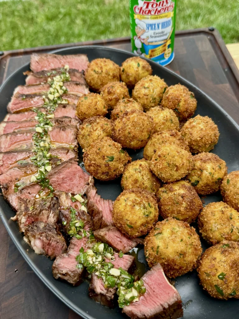 Crispy Potato Croquettes with Blackened Cajun Ribeye Steaks and Honey Butter