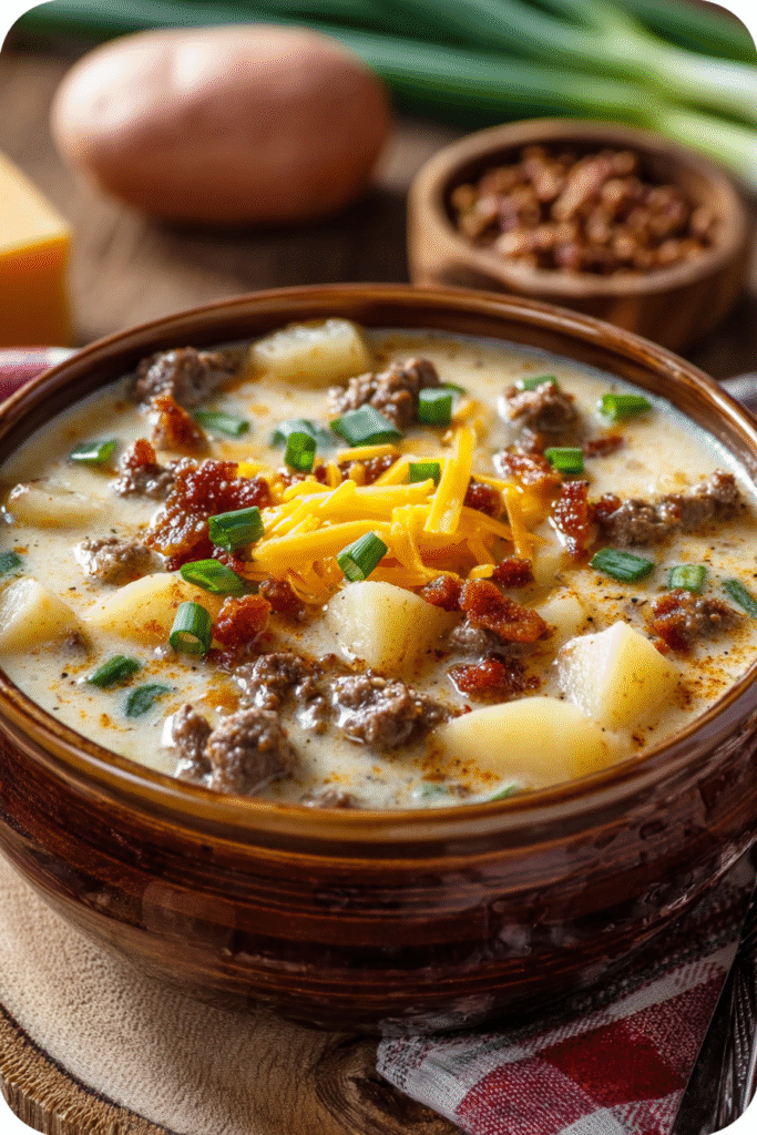 This hearty, slow-cooker comfort soup combines tender ground beef, chunky potatoes, and colorful vegetables in a rich, creamy broth enhanced with melted cheddar cheese, creating a satisfying one-pot meal that develops deep flavor through hours of gentle simmering. The recipe maximizes convenience through crockpot preparation that requires minimal active cooking time while filling your home with inviting aromas, then finishes with a luxurious addition of heavy cream and cheese that transforms simple ingredients into restaurant-quality soup. With its substantial texture, crowd-pleasing flavors that appeal across generations, and hands-off cooking method that fits seamlessly into busy schedules, this creamy potato soup represents the ultimate cold-weather comfort food that nourishes both body and soul while requiring remarkably little effort from the cook.