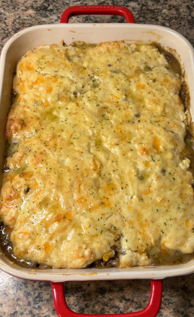 - Burnt Topping – If the biscuits are browning too fast, tent the dish loosely with foil for the last 5 minutes of baking.