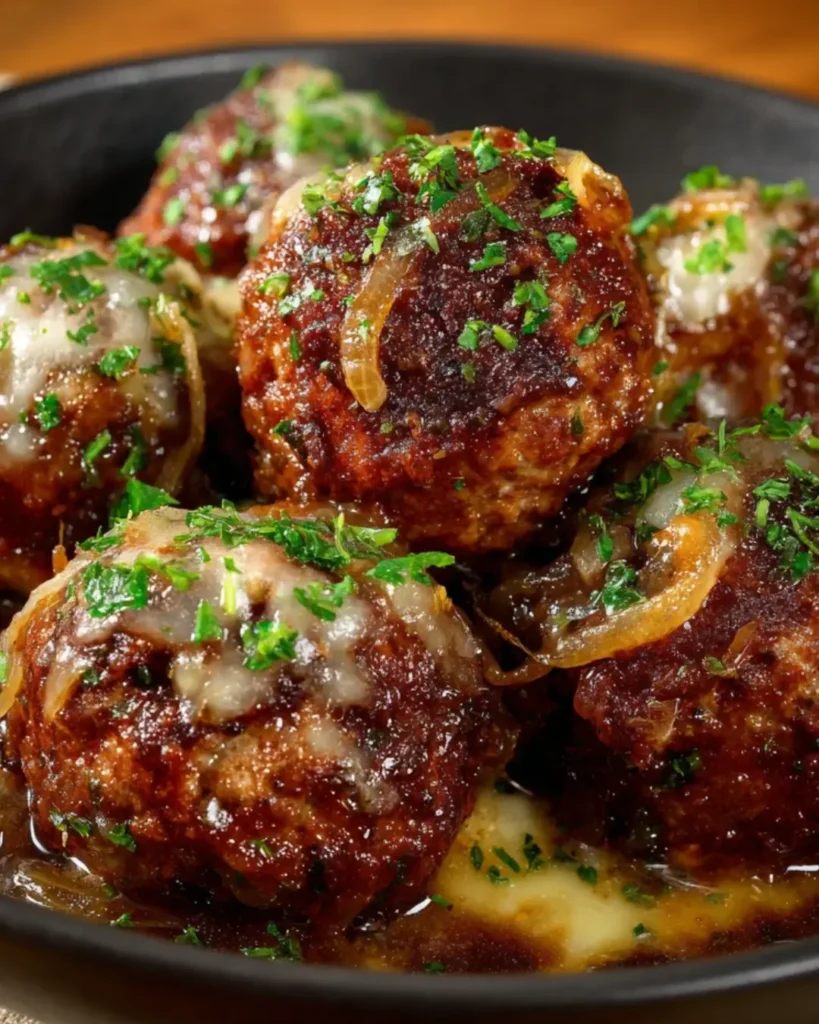 French Onion Meatballs demonstrate that creative fusion cooking can honor beloved classics while transforming them into new formats that solve practical problems—these meatballs capture all the flavors of French onion soup in a heartier, more substantial form that works as either appetizer or main course. The combination of familiar meatball comfort with sophisticated French onion character creates something that appeals to both traditionalists and adventurous eaters. This recipe proves that impressive, restaurant-quality dinners don’t require complicated techniques or obscure ingredients—just thoughtful combination of classic elements executed with proper method. Whether you’re seeking weeknight dinners that feel special, planning dinner parties that need impressive appetizers, wanting cold-weather comfort that warms from the inside out, or simply loving both meatballs and French onion soup, this versatile recipe adapts to your needs while consistently delivering that perfect bite where tender, herb-seasoned meatball meets sweet caramelized onions, savory broth, and melted Gruyère in rich, satisfying, absolutely delicious harmony that makes every meal feel like a celebration of French bistro cooking transformed into approachable, weeknight-friendly format.