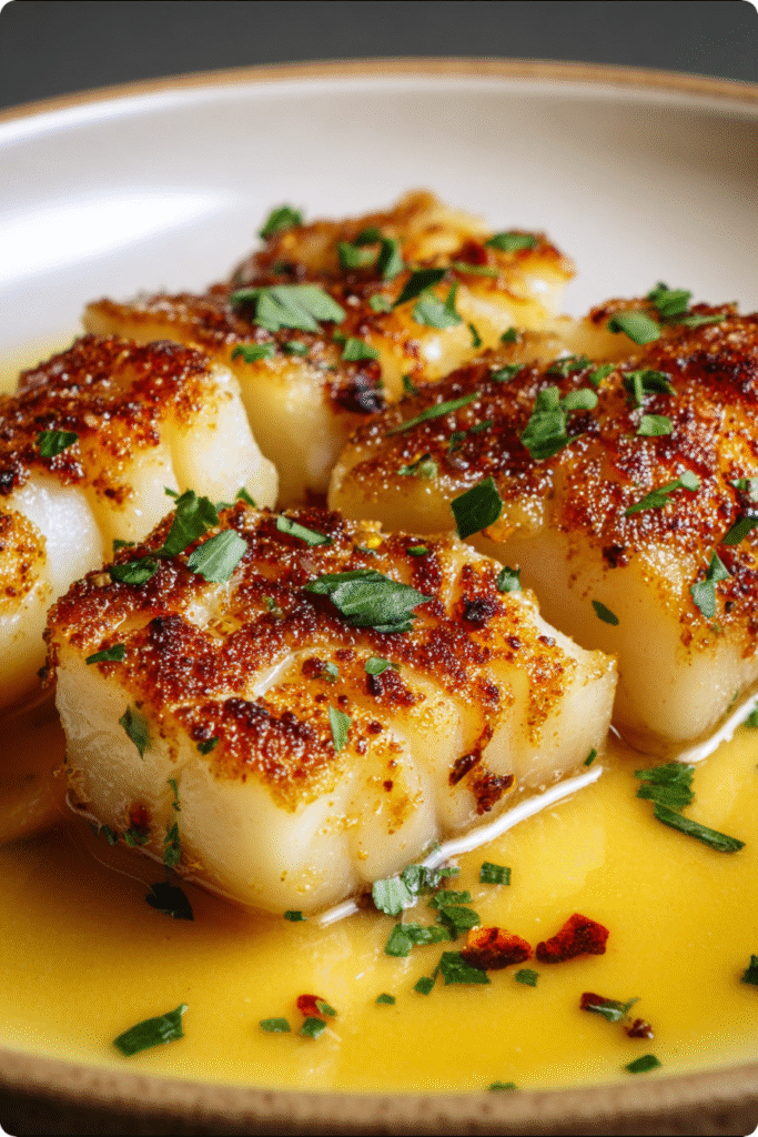 - Immediate Serving Recommended – Cod is best enjoyed immediately after cooking while the exterior remains slightly crisp and the butter sauce is hot and liquid; delaying service causes the fish to lose texture and the sauce to congeal.