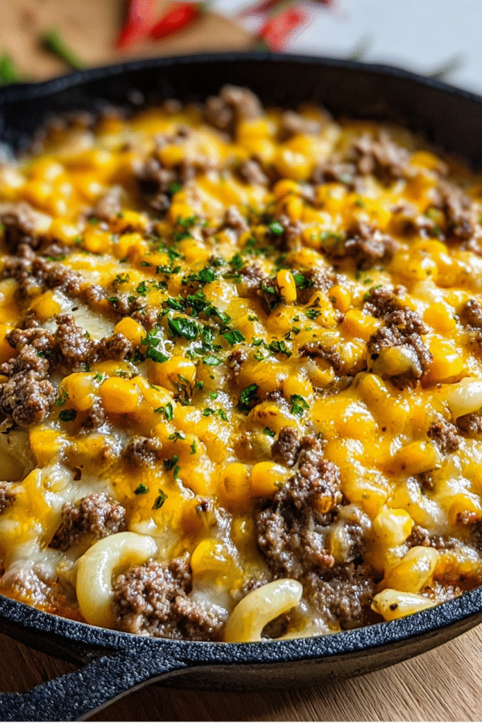 Remove the skillet from heat and garnish the melted cheese surface with freshly chopped parsley or sliced green onions for fresh color and herbaceous flavor. Serve directly from the skillet onto plates while hot, ensuring each portion contains beef, potatoes, corn, creamy sauce, and melted cheese in every serving.