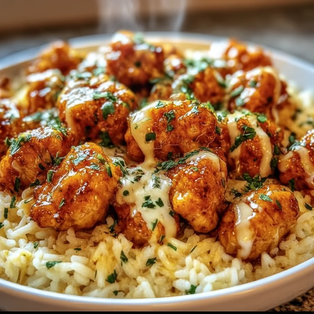Spoon the creamy rice onto serving plates or into bowls, creating a bed for the chicken. Top with the honey garlic chicken bites, making sure to drizzle any remaining sauce from the pan over everything.