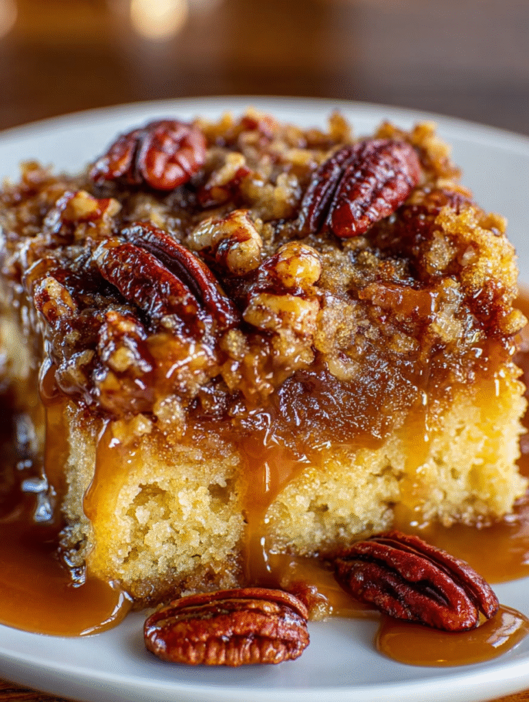 Dump cakes have been a Southern secret for decades, beloved for their simplicity and foolproof results. This pecan pie version takes the concept to new heights with layers of moist cake, a gooey caramel-pecan center, and a crispy pecan topping, all finished with a generous drizzle of salted caramel sauce. It’s the perfect solution for holidays, potlucks, or any time you want an impressive dessert without the stress.