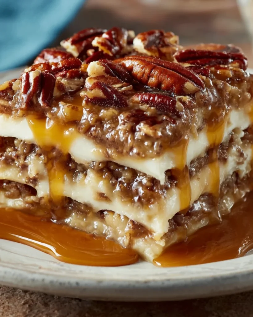 Irresistible Pecan Pie Lasagna Delight demonstrates that beloved classic desserts can be reimagined in formats that solve practical problems—easier serving, make-ahead convenience, crowd-friendly portions—while maintaining the essential flavors that made the original special. The layered presentation creates drama and visual interest impossible to achieve with traditional single-layer pie, while the no-bake approach (aside from the brief crust baking) makes this more accessible than mastering pie crust. This recipe proves that “lasagna” desserts—layered desserts inspired by the pasta dish’s stacked format—create impressive results that look professionally made while being achievable for home cooks. Whether you’re hosting Thanksgiving dinners that need crowd-pleasing alternatives to traditional pie, celebrating holidays when make-ahead desserts reduce stress, contributing to potlucks where you want stunning presentation, or simply loving pecan pie but wanting easier serving format, this versatile dessert adapts to your needs while consistently delivering that perfect forkful where buttery graham crust, fluffy cream cheese, rich pecan filling, and whipped topping come together in cool, impressive, absolutely delicious harmony that makes every celebration feel special and every slice taste like fall comfort perfected.