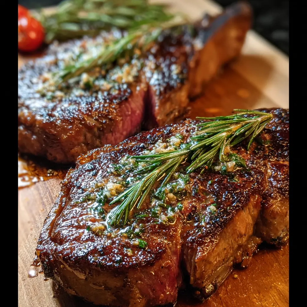 - Herb Butter Finish – Top the hot steak with a slice of compound butter (butter mixed with rosemary, thyme, and garlic) while it rests.