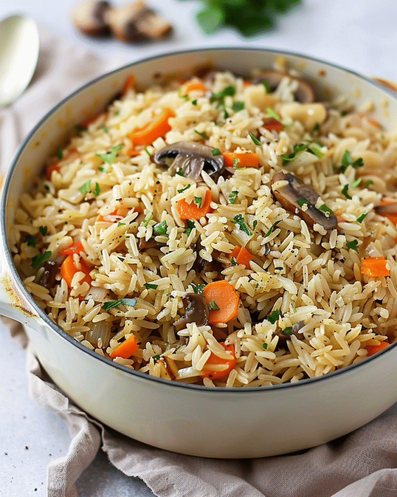 This Mediterranean rice dish succeeds by applying the traditional pilaf cooking method—toasting rice in fat before adding liquid—that creates superior texture and depth compared to plain boiled rice. Sautéing onions first until translucent develops their natural sugars through caramelization, creating sweet, aromatic base. Cooking mushrooms properly (allowing their moisture to release and evaporate) concentrates their umami-rich, earthy flavor—rushing this step creates watery, flavorless mushrooms. Adding garlic near the end of the mushroom cooking prevents it from burning while still allowing its aromatic compounds to bloom. Toasting the rice in the oil and vegetable mixture for 2 minutes gelatinizes the starch on the rice’s exterior, creating a coating that helps grains stay separate and fluffy while developing nutty flavor through light browning. The 2:1 liquid-to-rice ratio is standard for long-grain rice and ensures proper hydration—too much creates mush, too little leaves crunchy grains. Bringing liquid to a boil before reducing to simmer ensures the rice cooks at proper temperature throughout. Covering tightly traps steam that cooks the rice evenly; lifting the lid releases essential steam and creates uneven cooking. The low simmer (rather than rapid boil) ensures gentle, even cooking. Not stirring during cooking prevents rice from releasing excess starch that would create sticky, gummy texture. The 5-minute rest after cooking allows residual steam to finish cooking the rice while letting grains firm up slightly, creating the light, fluffy texture characteristic of perfect pilaf. Fluffing with a fork rather than stirring separates grains and releases steam. At 220 calories per serving with minimal fat and no cholesterol, this delivers wholesome nutrition appropriate for various healthy eating approaches.