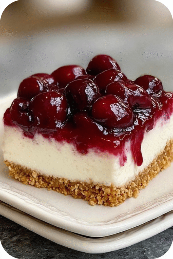 Final Chill and Serve – Return the topped cheesecake to the refrigerator for an additional 30 minutes to allow the cherry topping to set beautifully, then remove the springform pan sides (if using) and slice into wedges or squares using a sharp knife dipped in hot water and wiped clean between cuts.