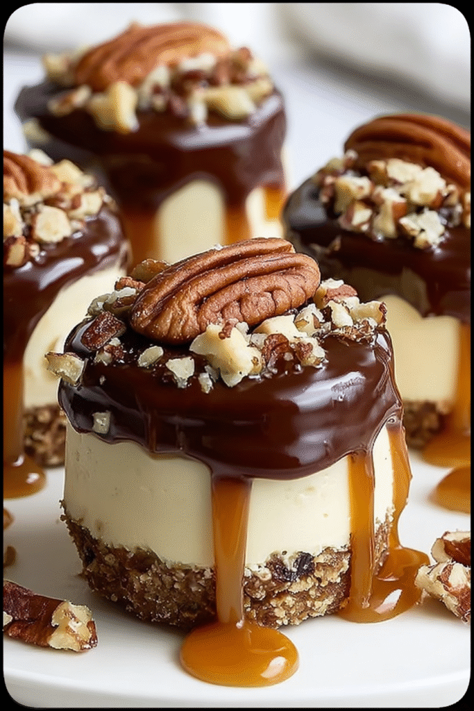 These No-Bake Turtle Mini Cheesecakes prove that impressive, elegant desserts don’t require ovens, special equipment, or professional pastry skills—just smart technique and quality ingredients combined thoughtfully. The recipe honors both classic cheesecake tradition and beloved turtle candy flavor profile while innovating through the no-bake method and individual presentation that makes serving effortless. While these are certainly sweet indulgences, the portion control inherent in the mini format prevents overindulgence, and the presence of pecans adds protein and healthy fats alongside the treat. The make-ahead requirement transforms from limitation into advantage when entertaining, as you can prepare these completely the day before and simply add final drizzles before serving. Whether you’re hosting a party, contributing to a potluck, celebrating a holiday, or simply treating yourself to something special without turning on the oven, these creamy, caramel-drizzled, pecan-topped mini cheesecakes deliver turtle candy nostalgia, elegant presentation, and crowd-pleasing satisfaction in every light, perfectly chilled, chocolate-finished bite.