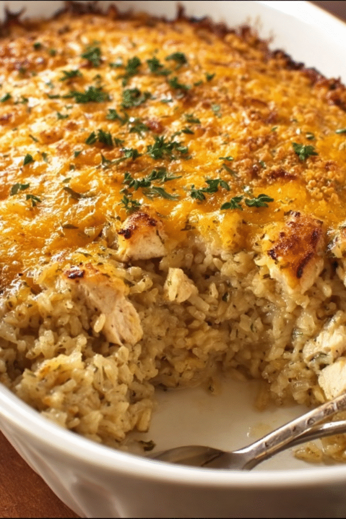 No-Peek Chicken and Rice Casserole represents the best of American comfort cooking—practical, economical, and foolproof, designed for real families with real time constraints who still want homemade meals. This recipe proves that delicious home cooking doesn’t require expensive ingredients, complicated techniques, or constant attention; sometimes the simplest combinations, given time and patience, create the most satisfying results. The genius lies not in culinary sophistication but in understanding how basic ingredients behave under specific conditions—how instant rice rehydrates, how chicken self-bastes in a sealed environment, how concentrated soups become sauce—and leveraging that knowledge into a reliable dinner solution. While 400 calories per serving is moderate for a complete meal, the portion sizes are genuinely filling, and the combination of protein, carbohydrates, and vegetables (if you add them) creates a balanced plate that keeps everyone satisfied. For those watching calories, you can reduce each serving to approximately 320-350 calories by using reduced-sodium, reduced-fat cream soups, increasing vegetables and decreasing rice slightly, and trimming chicken breasts of any visible fat—all while maintaining the essential ease and comfort that defines this recipe. The universal appeal means this casserole works equally well for picky toddlers, busy teenagers, and nostalgic adults who remember similar one-dish meals from their own childhoods. Whether you’re a working parent rushing home to feed hungry kids, a college student tackling your first “real” dinner, someone bringing comfort to a friend in need, or simply seeking that particular satisfaction that comes from pulling a complete, hot meal from the oven with minimal effort, this No-Peek Chicken and Rice Casserole delivers exactly what it promises—simple, satisfying comfort that proves some of the best recipes are the ones that make both the cooking and the eating as easy and enjoyable as possible.