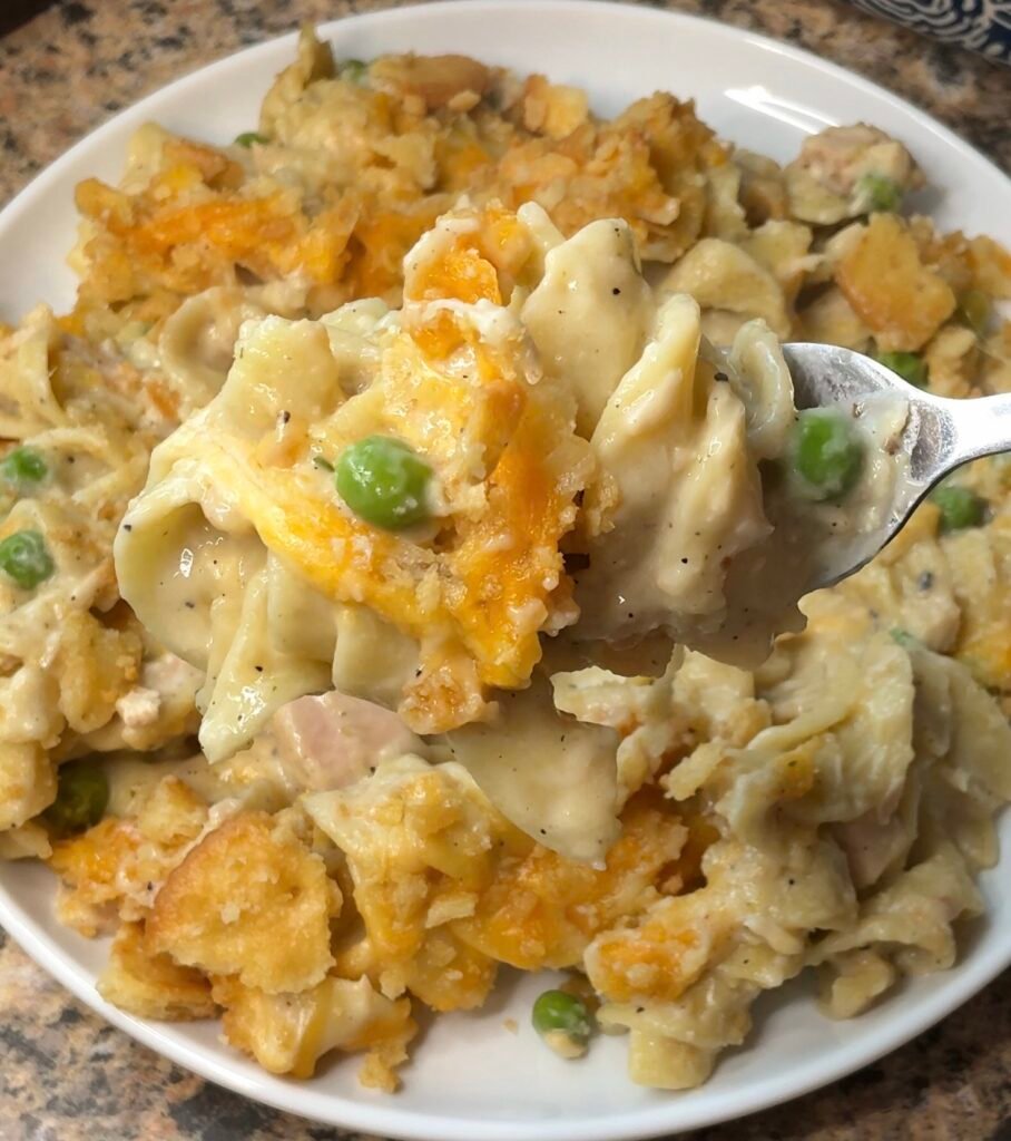 Old-Fashioned Tuna Noodle Casserole works because it balances moisture and starch absorption. Egg noodles are porous and absorb the liquid from the milk and soup mixture as they bake, infusing the pasta with flavor rather than just coating it. The “double soup” method (combining cream of chicken and celery) creates a complex savory base that mimics a slow-simmered béchamel sauce without the effort. Finally, the Ritz cracker topping provides a necessary textural contrast; without it, the dish would be soft-on-soft, but the buttery crunch makes every bite satisfying.