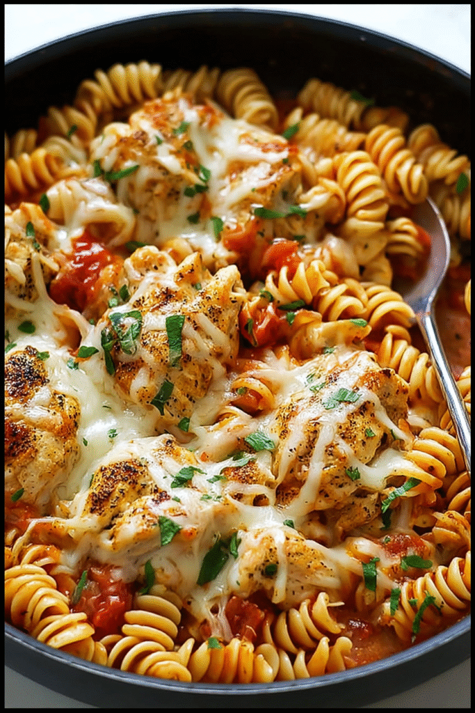 One-Pot Chicken Parmesan Pasta represents the successful adaptation of beloved Italian-American classics into modern convenience format, maintaining essential flavors while dramatically simplifying preparation and cleanup. This recipe appeals particularly to busy families seeking reliable weeknight meals, novice cooks wanting foolproof results, or anyone craving chicken Parmesan without the breading, frying, and baking that traditional versions demand. The one-pot method fundamentally changes the cooking experience by eliminating the juggling of multiple components, timing coordination, and extensive dish washing that typically accompanies pasta dinners. The 30-minute timeline proves that homemade meals can compete with takeout convenience while delivering superior taste, better nutrition, and lower cost. The universal appeal—chicken, pasta, marinara, cheese—ensures even picky eaters clean their plates without complaints, making this valuable for families with diverse preferences. While the 480-520 calorie estimate per serving represents substantial nourishment, the complete meal nature (protein, starch, vegetables, dairy) means no additional components are required beyond optional bread or salad, and the portions naturally satisfy without excessive consumption. For those seeking lighter versions, consider using whole wheat pasta, reducing cheese slightly, adding more vegetables, or using chicken thighs for different flavor; though these modifications will alter the comforting character that makes this special. Ultimately, this one-pot chicken Parmesan pasta deserves permanent status in weeknight dinner rotations as proof that satisfying, delicious, family-approved meals needn’t require culinary expertise, extensive time, or complicated preparation—sometimes the best cooking comes from understanding how to streamline without sacrificing quality, trusting simple techniques, and serving with the confidence that a pot of cheesy, saucy, comforting pasta represents one of life’s most reliable pleasures that brings everyone to the table with genuine enthusiasm.