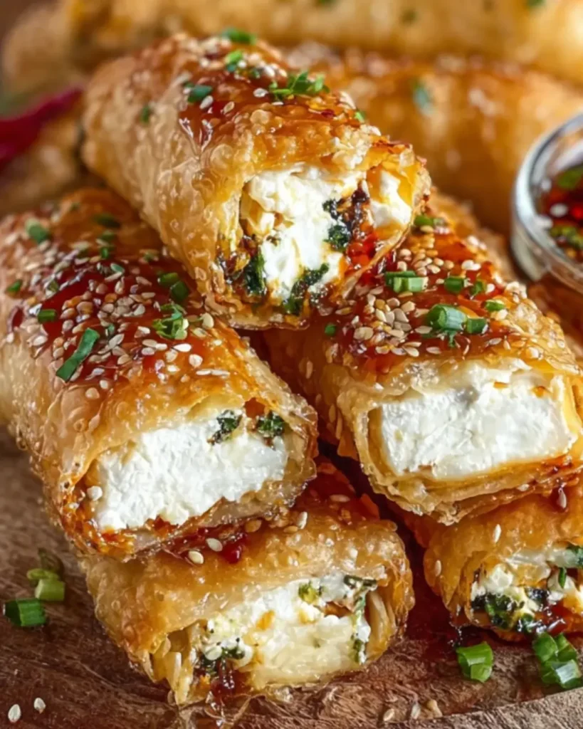 These Mediterranean-inspired appetizers transform flaky phyllo dough into crispy, golden rolls by layering buttered sheets, filling them with a savory mixture of tangy feta cheese, fresh spinach, and aromatic herbs, then baking until shatteringly crisp before drizzling with sweet-spicy chili honey that creates irresistible flavor contrast. The oven-baking method achieves the crispy texture of deep-frying without the mess or excess oil, while the hot honey trend—sweet honey infused with red chili flakes—adds sophisticated sweet-heat that makes these impossible to stop eating.