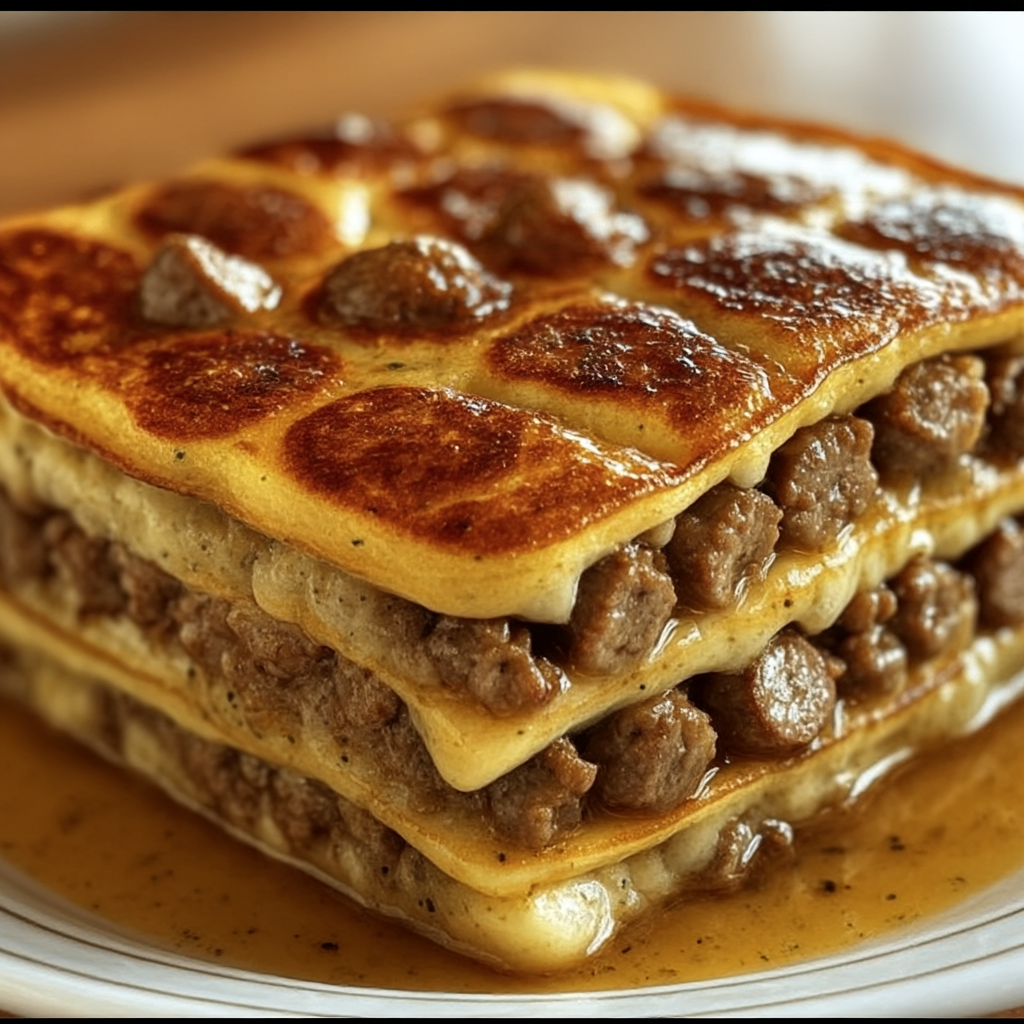 This Pancake Sausage Casserole transforms breakfast into an impressive layered dish that combines fluffy pancakes with savory beef sausage and rich cheese sauce. The recipe creates a stack of pancakes interspersed with seasoned ground beef sausage and creamy cheese layers, then finished with a glossy brown sauce and additional sausage