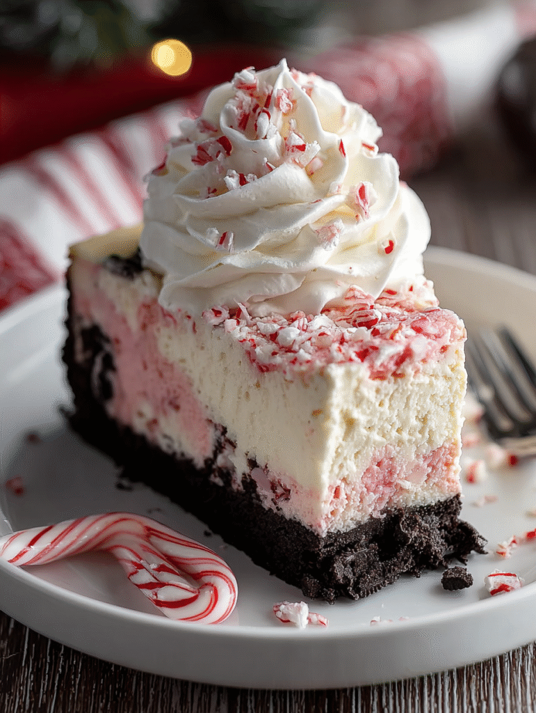 Sprinkle crushed candy canes generously over the whipped cream and on top of the cheesecake surface. Add mini candy canes or peppermint lollipops as decorative garnishes, inserting them at angles into the whipped cream.