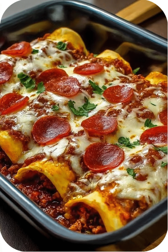This recipe exemplifies successful fusion cooking by thoughtfully combining pizza and enchilada elements into cohesive dish that respects both culinary traditions while creating something new. The familiar pizza flavors—pepperoni, mozzarella, Italian seasoning, pizza sauce—make this immediately recognizable and appealing, particularly to children or picky eaters who might resist traditional Mexican enchiladas. The 45-minute total time with straightforward assembly makes this genuinely practical for weeknight preparation, especially when considering the make-ahead potential that allows advance assembly with dinner-time baking. At approximately 500-550 calories per enchilada, this provides hearty portion appropriate for active individuals or growing children, though the cheese and meat content creates calorie density requiring consideration for weight management goals. For lighter version, use ground turkey instead of beef, reduce cheese quantities by one-third, and increase vegetable content to cut approximately 100-120 calories per serving while maintaining satisfying portions. The recipe’s inherent flexibility—substitute any pizza toppings you prefer—makes this adaptable template that accommodates dietary restrictions, ingredient availability, and personal preferences. This suits families seeking budget-friendly meals using pantry staples and affordable proteins, while the fun presentation and interactive eating experience make dinner feel special despite simple preparation. The leftovers reheat exceptionally well, making this practical for meal prep or planned leftovers that save time on subsequent busy evenings.