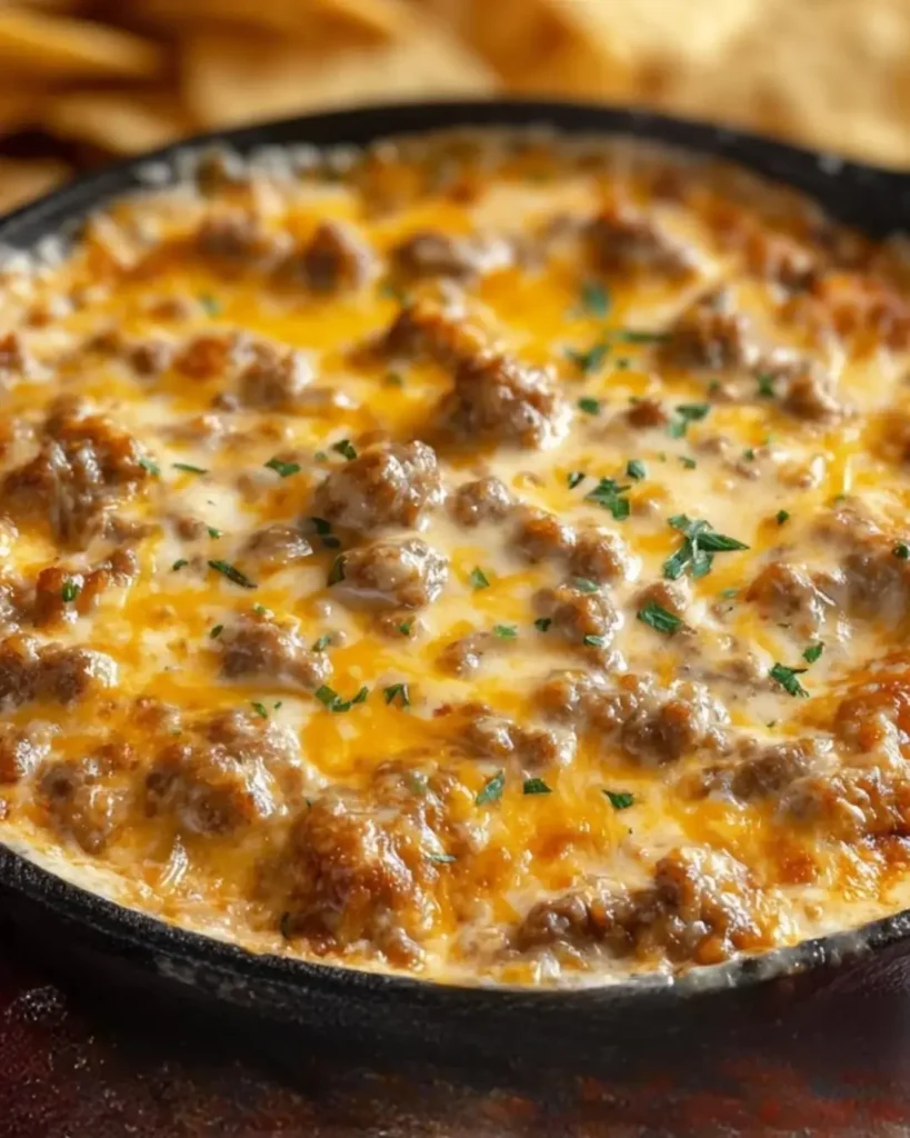 Sausage Cheese Dip demonstrates that the most popular party appetizers often feature straightforward combinations of universally loved ingredients—meat, cheese, mild heat—executed properly to create addictive results that disappear quickly. The quick 25-minute preparation makes this genuinely achievable even when you’re hosting and juggling multiple tasks, while the make-ahead potential reduces party-day stress. This recipe proves that crowd-pleasing doesn’t mean boring or unsophisticated—the combination of savory sausage, triple cheese creaminess, and southwestern spice creates complex, satisfying flavors that appeal across age groups and taste preferences. Whether you’re hosting game day parties that need hearty appetizers, contributing to potlucks where you want guaranteed crowd-pleasers, celebrating holidays when you need reliable favorites, or simply wanting the kind of addictive dip that makes every gathering memorable, this versatile recipe adapts to your occasion while consistently delivering that perfect scoop where creamy cheese, savory sausage, and mild southwestern heat come together in rich, satisfying, absolutely delicious harmony that keeps everyone coming back until the bowl is scraped clean.