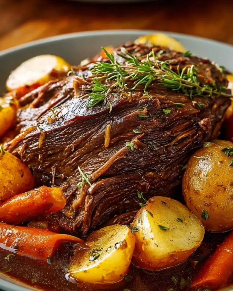This ultimate American comfort food transforms a tough beef chuck roast into fall-apart tender perfection by searing it to develop deep, caramelized flavor, then slow-cooking for 8-10 hours in aromatic beef broth infused with Worcestershire sauce, thyme, and rosemary alongside hearty carrots, potatoes, and onions that absorb all the savory