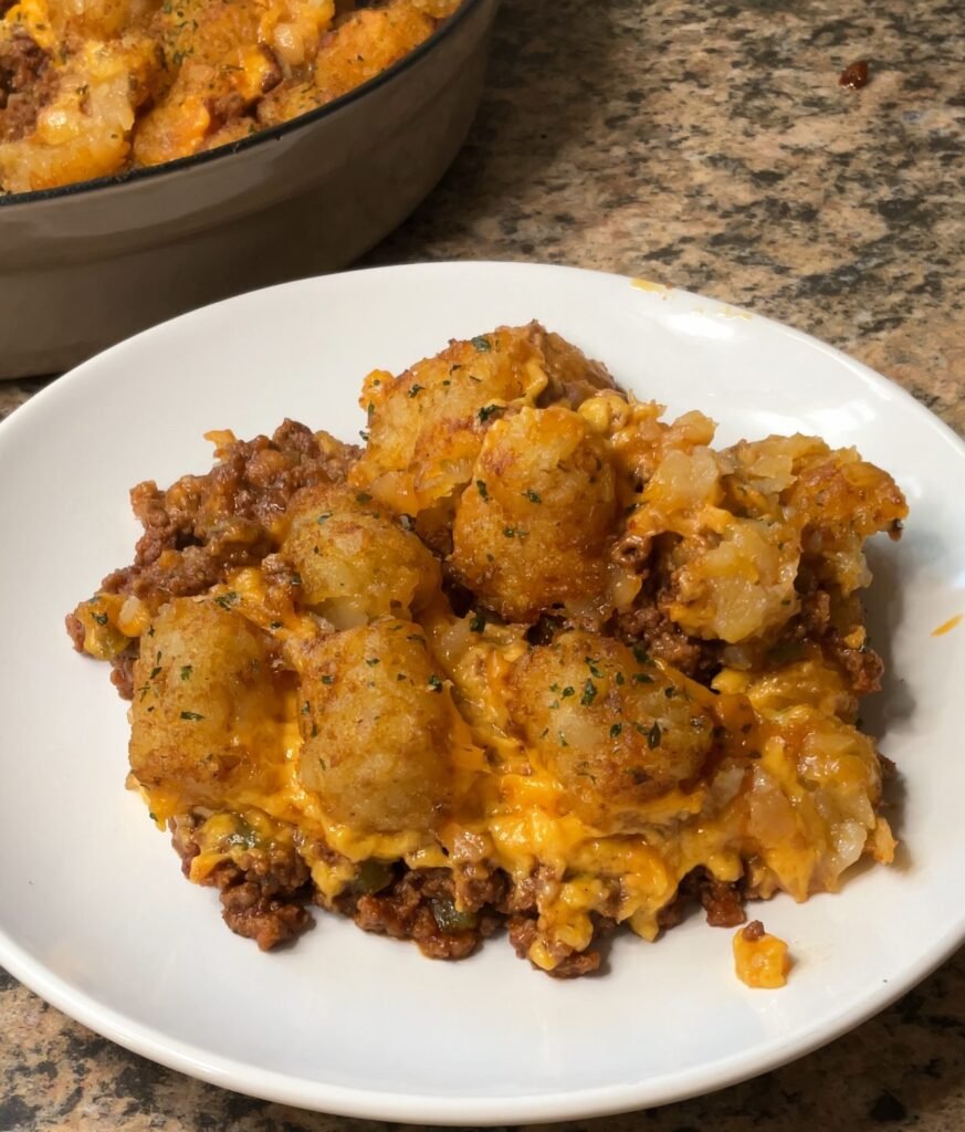 This sloppy joe tater tot casserole succeeds by combining the beloved elements of two comfort food classics in proper proportions while using technique that ensures each component achieves its ideal texture. The ground beef browned with onions, peppers, and garlic develops rich, savory flavor through the Maillard reaction while the vegetables soften and sweeten. Cooking the tomato paste for 3 minutes after adding it caramelizes its sugars and eliminates raw taste—this step intensifies tomato flavor significantly. The combination of tomato sauce, ketchup, brown sugar, and Worcestershire sauce creates the characteristic sweet-tangy profile of sloppy joes—the ketchup and brown sugar provide sweetness, the tomato sauce adds body, and the Worcestershire contributes umami depth. Simmering this mixture allows flavors to meld while reducing excess liquid that would make the casserole watery. The sharp cheddar cheese melted between the meat and tater tots creates gooey, rich layer while its sharpness balances the sweet meat sauce. Using freshly grated cheese ensures smooth melting. The frozen tater tots arranged in a single layer provide the signature topping—frozen tots straight from the bag crisp better than thawed ones. Baking at 400°F provides hot enough temperature to crisp the tots while heating everything through and melting the cheese. The 40-minute timing ensures the tots achieve proper golden-brown crispness without drying out the meat mixture. At approximately 520-570 calories per serving, this is a substantial, moderately indulgent comfort food meal that provides good protein from beef, carbohydrates from tater tots, and calcium from cheese—it’s richer than plain ground beef but comparable to many casseroles while being more satisfying.