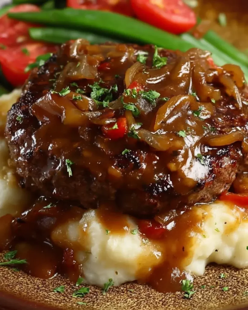Garnish and Serve Transfer the hamburger steaks to serving plates or a large platter, arranging them attractively. Spoon generous amounts of the mushroom-onion gravy over and around each steak. Garnish with freshly chopped parsley for color and a hint of fresh flavor. Serve hot over mashed potatoes, rice, egg noodles, or with crusty bread to soak up the delicious gravy.