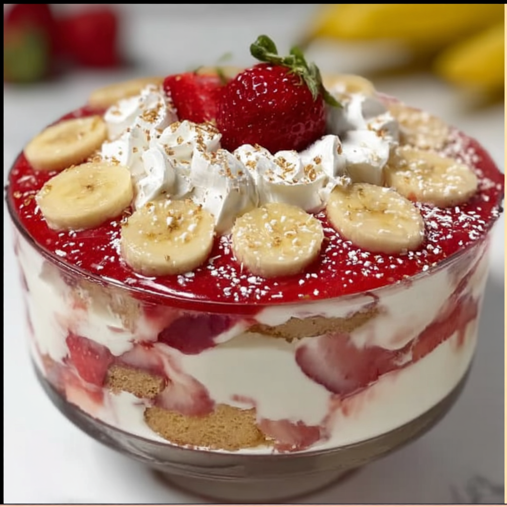 This no-bake layered dessert combines the nostalgic comfort of classic banana pudding with fresh strawberries and a buttery vanilla wafer crust. The recipe features velvety vanilla pudding mixed with cream cheese and sweetened condensed milk, folded together with whipped topping and layered with ripe bananas and juicy strawberries. The result is a light yet indulgent dessert that’s visually stunning and irresistibly creamy in every spoonful.