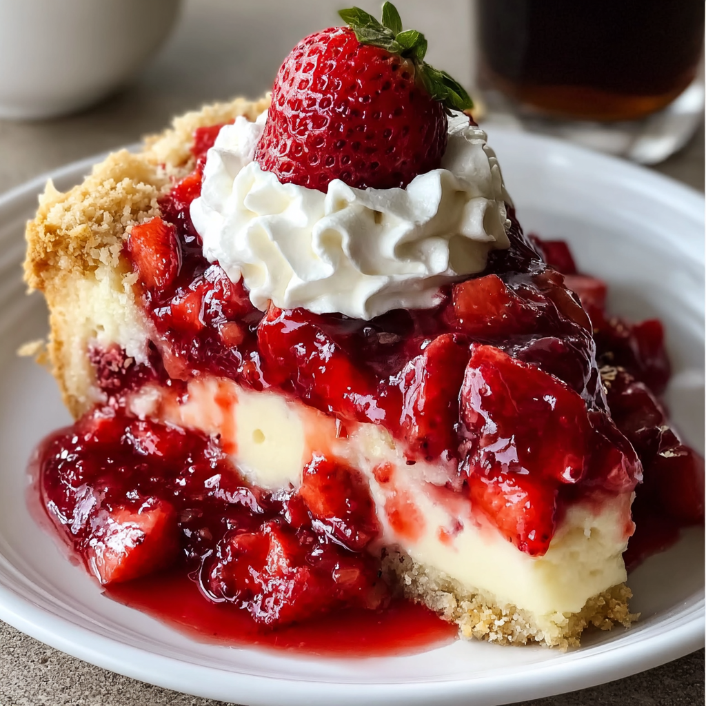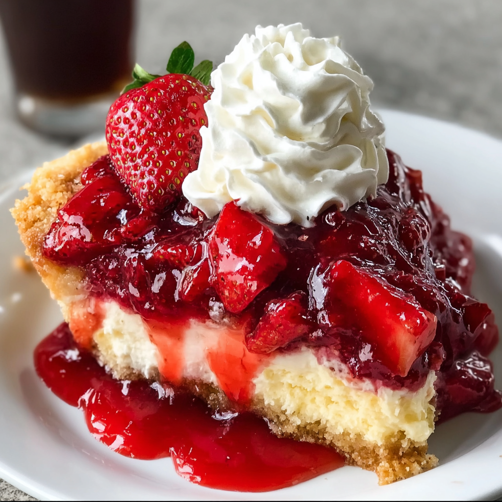 Strawberry Cheesecake Dump Cake represents the best of American home baking—practical, unfussy, and designed for real people who want homemade desserts without culinary school training or hours of free time. This recipe proves that “easy” doesn’t mean “inferior”; sometimes the simplest methods produce the most craveable results, especially when they combine universally loved flavors like strawberries and cheesecake in an accessible format. The beauty of dump cakes lies not just in their simplicity but in their forgiving nature—small variations in technique or slight measurement differences rarely result in failure, making them perfect confidence-builders for nervous bakers. While 320 calories per serving is indulgent, desserts are meant to be treats enjoyed in moderation, and this recipe’s built-in portion control (cut into 12 squares) helps prevent overindulgence that often happens when slicing freeform cakes. For those watching calories more strictly, you can reduce each serving to approximately 260-280 calories by using sugar-free pie filling, reduced-fat cream cheese, and cutting smaller portions, or serve with fresh fruit instead of ice cream. The versatility means you’ll never tire of this recipe—change the filling with the seasons, match cake mix to holiday themes, or customize to family preferences, creating endless variations from one master technique. Whether you’re a working parent rushing to get dinner and dessert on the table, a novice baker building confidence, or an experienced cook who simply wants something easy and delicious, this Strawberry Cheesecake Dump Cake delivers maximum satisfaction with minimal effort, proving that sometimes the best recipes are the ones that get out of your way and let you enjoy the results.