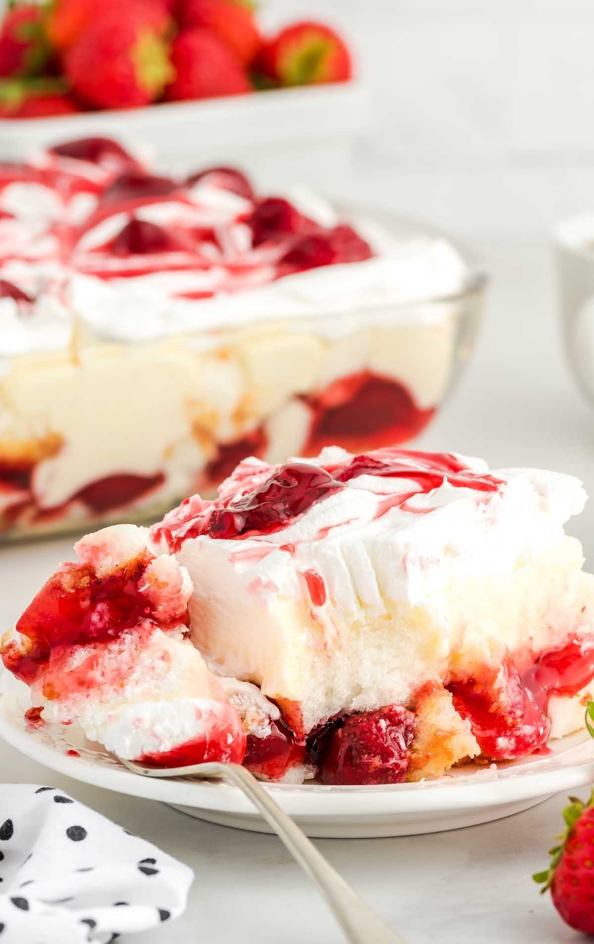 This ethereal dessert features layers of airy angel food cake, luscious strawberry pie filling, and a rich vanilla custard, all finished with a cloud of whipped topping. It is a refrigerator-style icebox cake that relies on an extended chilling period to meld the flavors and soften the cake into a decadent, pudding-like consistency.