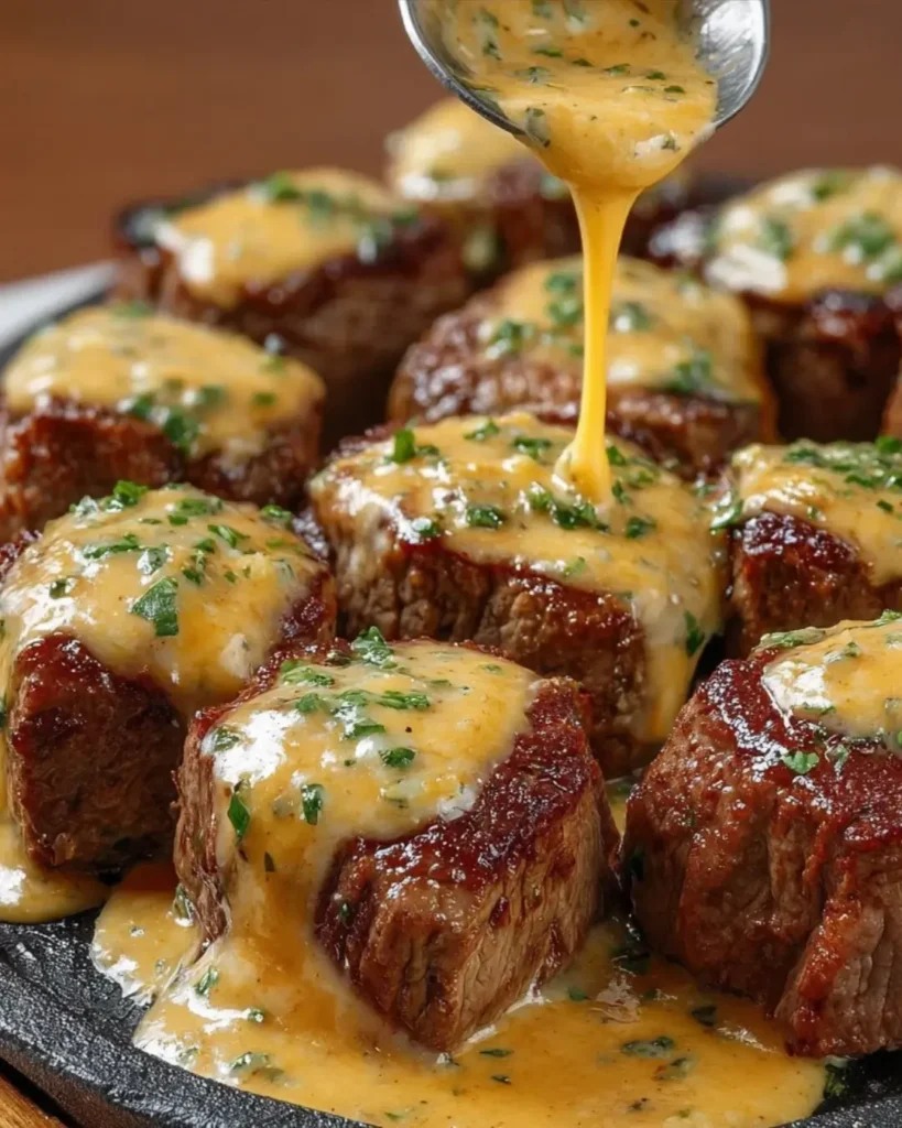 Texas Roadhouse-Inspired Cheesy Butter Steak Bites demonstrate that restaurant-quality steakhouse appetizers don’t require professional kitchens, expensive equipment, or culinary training—just proper searing technique, quality beef, and a well-balanced compound butter executed efficiently. The 25-minute timeline makes this genuinely practical for weeknight cooking when you want something impressive, while the party-perfect format ensures these work equally well for casual entertaining or game day gatherings. This recipe proves that the most craveable dishes often feature simple elements—perfectly seasoned beef, rich butter, melted cheese—combined thoughtfully with attention to proper technique. Whether you’re hosting game day parties that need crowd-pleasing finger food, following low-carb diets that deserve indulgent options, planning weeknight dinners that should feel special, or simply loving the combination of smoky-seasoned steak and cheesy butter, these versatile bites adapt to your needs while consistently delivering that perfect piece where caramelized, tender beef meets garlicky compound butter in quick, addictive, absolutely delicious harmony that makes every occasion feel like a steakhouse celebration worth savoring.