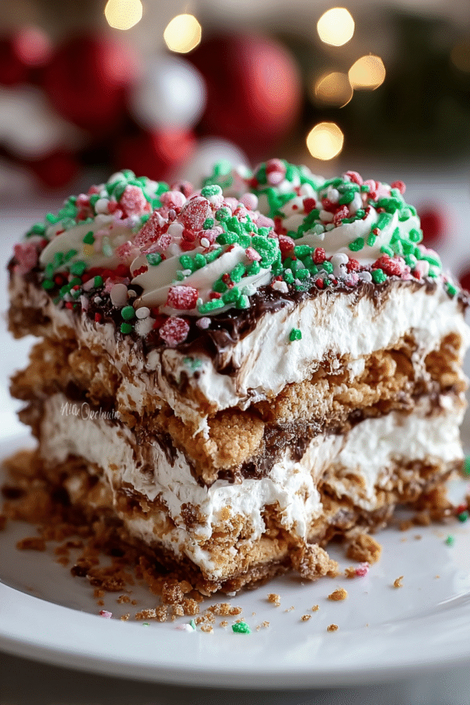 The Ultimate Christmas Cookie Lasagna exemplifies modern holiday baking’s evolution toward convenience without sacrificing visual impact or celebratory spirit. This recipe appeals particularly to busy hosts managing multiple holiday commitments, those lacking oven space during peak cooking seasons, or anyone seeking impressive desserts that don’t require professional pastry skills. The “lasagna” designation cleverly references the layered structure while the festive name and decoration clearly signal this as celebration food designed to create joy and wonder. The no-bake nature removes barriers of temperature management, timing precision, and baking anxiety that prevent many from attempting homemade holiday desserts. The make-ahead requirement transforms from limitation to advantage, allowing preparation during calm moments rather than chaotic day-of cooking. While the 380-420 calorie estimate per serving represents significant indulgence, the holiday context and special-occasion nature appropriately frame this as celebratory treat rather than everyday dessert, with the understanding that holidays are precisely when such indulgences create memories and traditions. For those seeking lighter versions, consider using reduced-fat cream cheese, sugar-free pudding, and light whipped topping; though these modifications will alter both texture and flavor that define the “ultimate” designation. Ultimately, this recipe deserves a permanent place in holiday collections as proof that impressive, beautiful, delicious desserts needn’t require advanced skills, extensive time, or oven access—sometimes the best celebrations come from simple ingredients, thoughtful layering, and the understanding that presentation, color, and festive spirit create magic just as surely as elaborate techniques ever could.