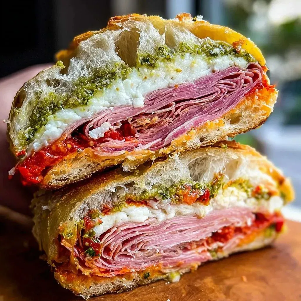 The Italian Muffuletta Sandwich is a showstopping creation that combines the best of New Orleans sandwich tradition with fresh Italian deli flavors. This towering masterpiece of layered mortadella, creamy mozzarella, vibrant pesto, and sweet roasted peppers delivers an unforgettable eating experience with every bite.