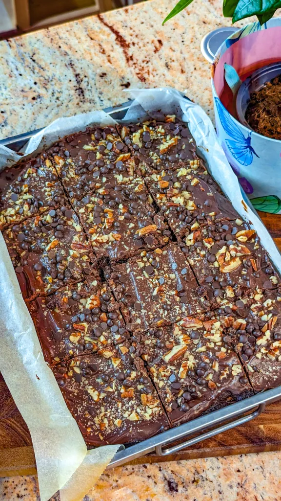 Garnish Sprinkle the remaining ½ cup chopped pecans and additional chocolate chips over the frosted top in an attractive pattern, pressing them gently into the frosting so they adhere.