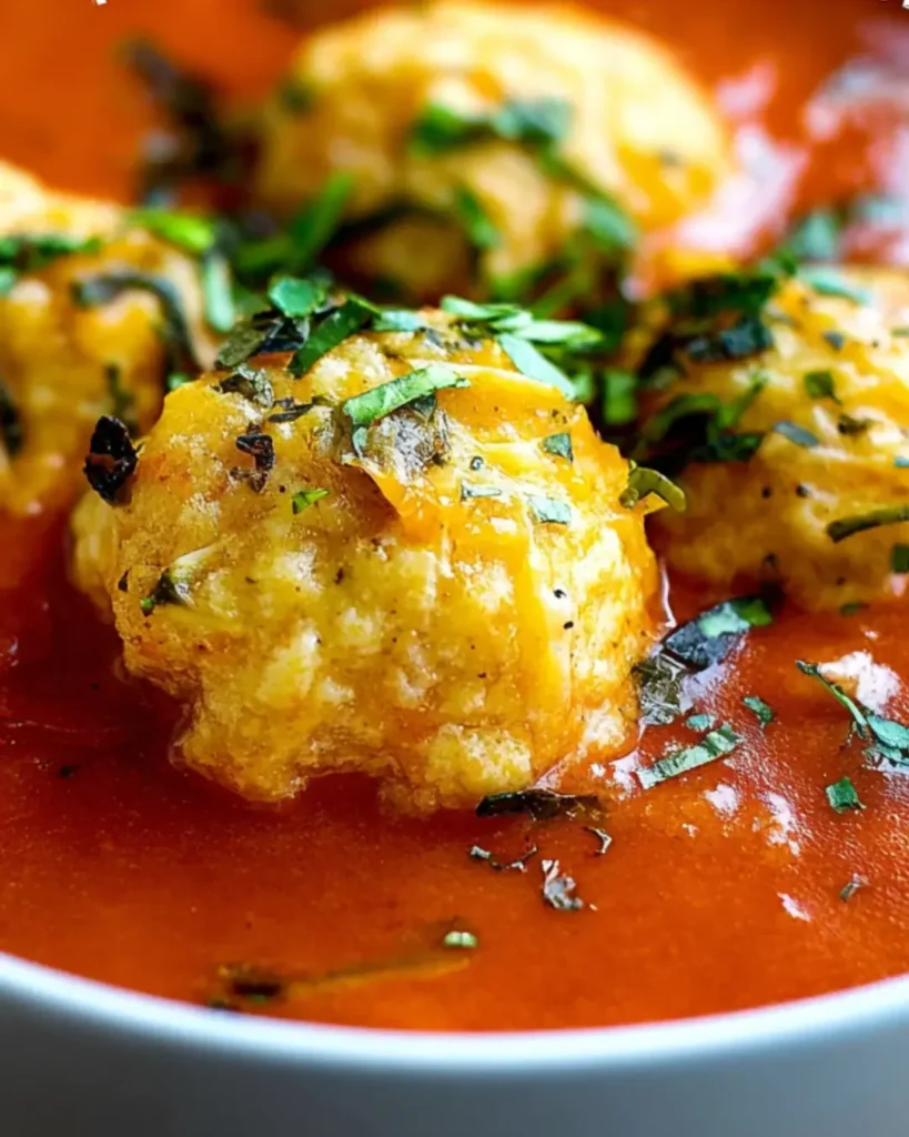 Wholesome Tomato Soup with Cheddar Bay Dumplings demonstrates that the most memorable comfort foods often combine beloved classics in unexpected ways that create something greater than either component alone. The genius of steaming dumplings directly on soup rather than baking separately transforms this from soup-and-bread into cohesive one-pot meal where each element enhances the other. This recipe proves that restaurant-famous flavors—those Cheddar Bay biscuits—can be adapted creatively into home cooking that honors the original while serving different purposes. Whether you’re seeking cold-weather dinners that warm from the inside out, wanting comfort food that soothes after challenging days, planning casual gatherings that deserve homey yet impressive food, or simply loving the combination of creamy tomato soup and cheesy dumplings, this versatile recipe adapts to your needs while consistently delivering that perfect spoonful where velvety tomato soup, fluffy cheddar dumpling, and fresh herbs come together in warming, satisfying, absolutely delicious harmony that makes every bowl feel like a celebration of American comfort food at its creative, soul-soothing finest.
